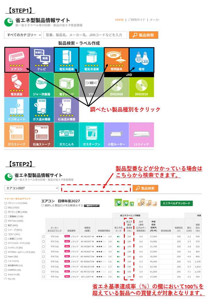 上記のうち、経済産業省資源エネルギー庁が発行している省エネ性能カタログ(製品の購入時点で最新のもの)において、省エネ基準達成率100%以上のもの。